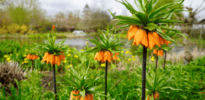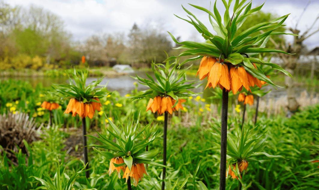 A species of flowering bulb in the lily family, find clusters of flowering crown imperials surrounding the Temple Lake. Available in a few vibrant colour shades you can find reddy-orange and bright yellow varieties in our Gardens. Crown Imperials have a unique fragrance that repels moles, mice and other rodents. The flower bells wear a crown of pointed leaves at the top of their long robust stems.